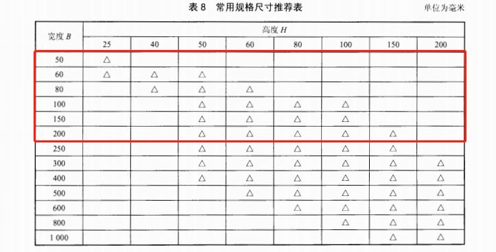 金屬線槽的規(guī)格定義一般是小于200mm以下的,下面提供了一份來自于JB∕T 10216-2013 《電控配電用電纜橋架》表8所示的市面上常用的金屬線槽規(guī)格參考: