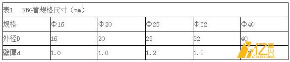 套接扣壓式薄壁鋼導(dǎo)管,簡(jiǎn)稱KBG管。導(dǎo)管采用優(yōu)質(zhì)冷軋帶鋼,經(jīng)高頻焊管機(jī)組自動(dòng)焊縫成型、雙面鍍鋅而制成。管材壁厚均勻,卷焊圓度高,與管接頭公差配合好,焊縫小而圓順,管口邊緣平滑。有Φ16、Φ20、Φ25、Φ32、Φ40五種規(guī)格,管壁厚度分別為1mm或1.2mm,見表1。導(dǎo)管出廠長(zhǎng)度均為4m。