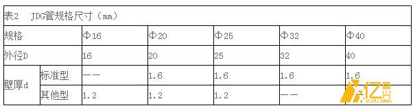 套接緊定式鍍鋅鋼導(dǎo)管,簡(jiǎn)稱JDG管。導(dǎo)管采用優(yōu)質(zhì)冷軋帶鋼,經(jīng)高頻焊機(jī)組自動(dòng)焊縫成型、雙面鍍鋅保護(hù);壁厚均勻,卷焊圓度高,與管接頭公差配合好,焊縫小而圓順,管口邊緣平滑;用配套彎管器彎管時(shí)橫截面變形小。導(dǎo)管出廠長(zhǎng)度為4m,共有Φ16、Φ20、Φ25、Φ32、Φ40五種規(guī)格。標(biāo)準(zhǔn)型導(dǎo)管壁厚為1.6mm,預(yù)埋、吊頂敷設(shè)均適用;其他型導(dǎo)管壁厚為1.2mm,僅適用于吊頂敷設(shè)。見表2。