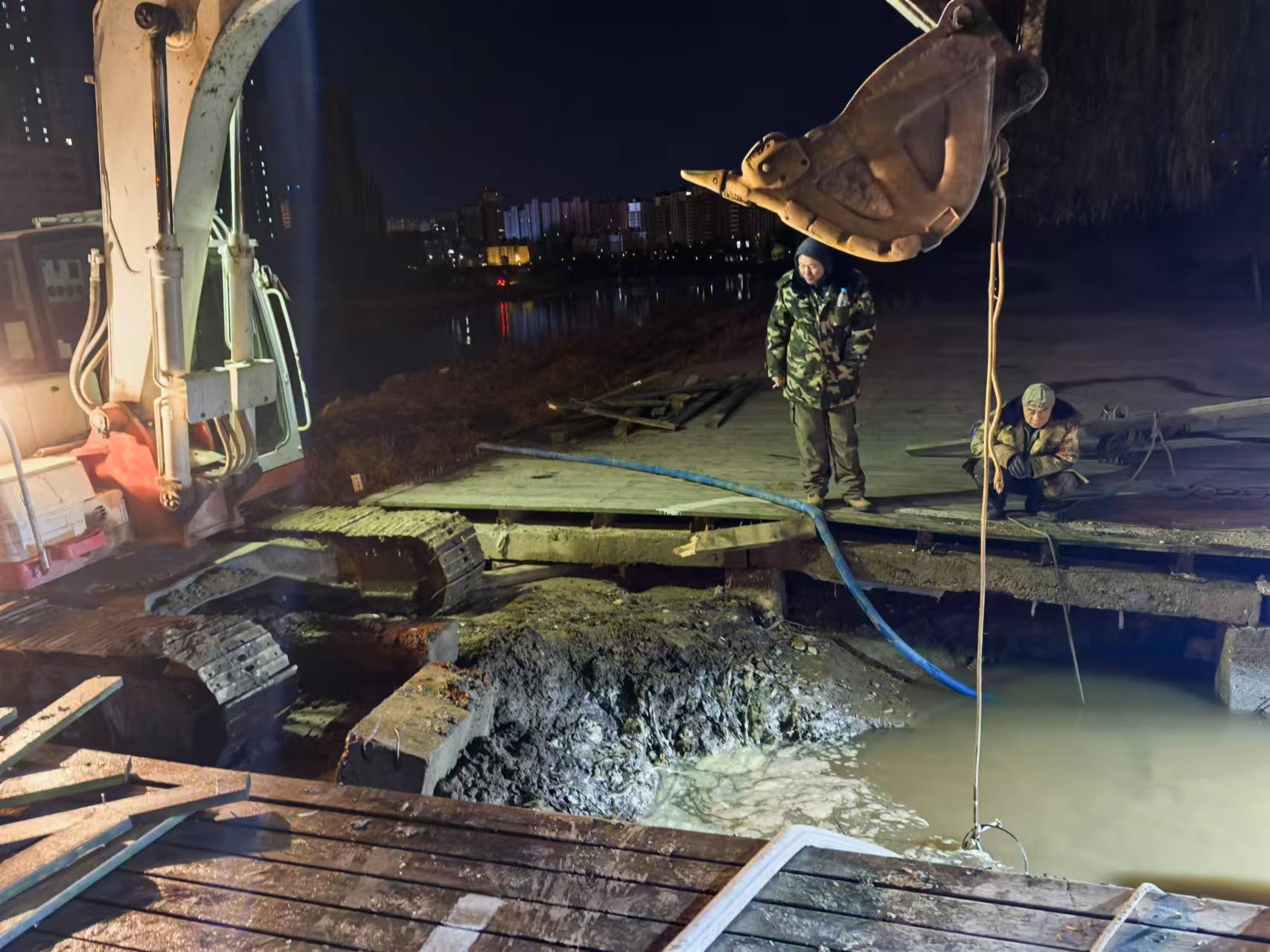 搶修人員進入施工現場后,通過仔細勘察確定維修方案,隨即展開接電、排水、挖掘土方等維修工作。由于主管線位于地下5米多深的砂石土質,挖掘時又多次出現塌方,施工一度受挫。為縮短搶修時間,盡快恢復供水,我處先后將4個維修隊調入施工現場,輪番上陣。搶修人員在深夜靠著應急燈照亮,冒著零下四五度的低溫,在冰冷的泥漿中爭分奪秒、連續奮戰,經過15個小時的奮力搶修于次日早上7點30分恢復供水。